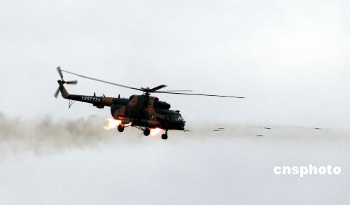 圖為訓練中,武裝直升機對恐怖分子實施武力打擊。