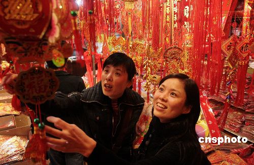 十二月三十一日,為了迎接新年,福建泉州購買喜慶用品的市民絡(luò)繹不絕,市場熱鬧非凡!氨瘛睊旒、彩燈、“中國結(jié)”等的銷售異常火爆,家家戶戶都將自家里里外外裝點(diǎn)一新迎接新年。中新社發(fā) 傅丹丹 攝