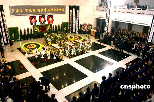 為保護(hù)湖南電網(wǎng)而犧牲的湖南電力公司羅海文、羅長(zhǎng)明、周景華三烈士追掉會(huì),1月30日在長(zhǎng)沙陽(yáng)明山殯儀館舉行,上千群眾前往悼念。湖南省委常委、長(zhǎng)沙市委書(shū)記陳潤(rùn)兒,省人大常委會(huì)副主任陳叔紅,省人民政府副省長(zhǎng)陳肇雄,省政協(xié)副主席陽(yáng)寶華,省軍區(qū)副政委萬(wàn)建華等省領(lǐng)導(dǎo)前往悼念。圖為湖南各界沉痛悼念抗冰保電的三位烈士。中新社發(fā) 殷中民 攝