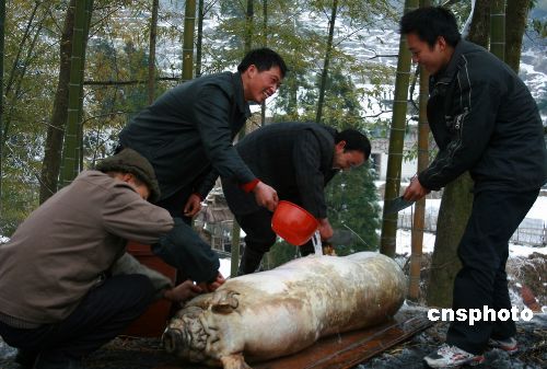 2月4日是農(nóng)歷的“立春”節(jié)氣,被冰雪封凍20多天的廣西融水縣滾貝鄉(xiāng)災(zāi)民殺豬喜迎新春。由于得到當?shù)卣募皶r救助,面對遭受57年來最嚴重的雨雪冰凍災(zāi)害,災(zāi)民們對未來依然充滿信心。中新社發(fā) 張耀華 攝