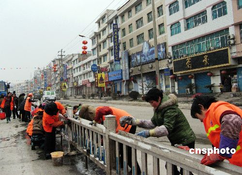 春節(jié)期間,貴州福泉市組織2000余名干部職工、武警官兵在市區(qū)街頭巷尾和205省道(馬遵公路福泉段)上清理凝凍冰雪過新年。 中新社發(fā) 易勝武 攝