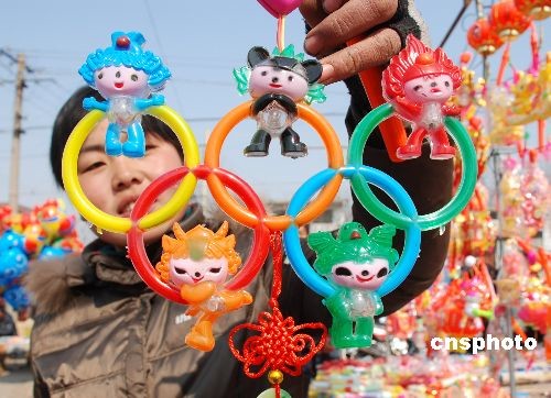 元宵節(jié)臨近,2月15日,在山東棗莊山亭區(qū)農(nóng)村大集上,與奧運(yùn)主題相關(guān)的居室飾品、時(shí)尚花燈等商品備受人們青睞,“奧運(yùn)經(jīng)濟(jì)”格外火爆。中新社發(fā) 劉明祥 攝