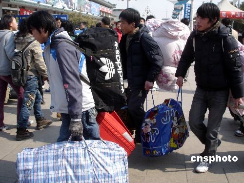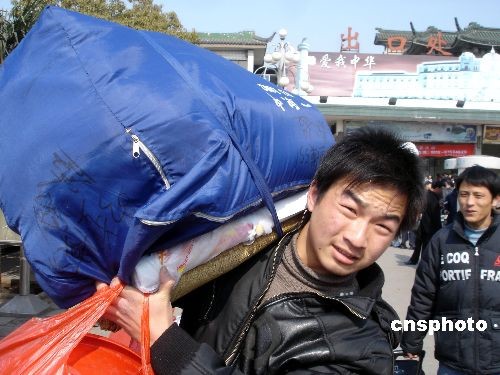 2月17日,返蘇民工扛著包裹從蘇州火車站走出。近日,外來務工人員返回蘇州呈現(xiàn)高峰,蘇州火車站客流量明顯上升。據(jù)悉,蘇州火車站平均日接收外來民工達3萬余人。中新社發(fā) 王建康 攝