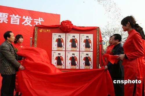 2月23日,《京劇凈角》曹操特種郵票在河南許昌首發(fā)!毒﹦艚恰诽胤N郵票一套6枚,為徐彥昭、包拯、廉頗、張飛、曹操、楊延嗣6位人物的京劇傳統(tǒng)劇目典型形象,此套郵票是繼《京劇生角》、《京劇旦角》、《京劇丑角》特種郵票之后發(fā)行的最后一套京劇題材類(lèi)郵票。這套郵票的發(fā)行,將對(duì)弘揚(yáng)傳統(tǒng)文化、振興京劇藝術(shù)起到推動(dòng)作用。 中新社發(fā) 牛書(shū)培 攝