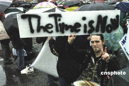 3月19日是美國對伊開戰(zhàn)五周年日。在美國紐約多個反戰(zhàn)組織以集會游行的方式要求政府結束伊戰(zhàn)。圖為在紐約的一個反戰(zhàn)集會上,一名美國青年一手比劃著和平的標志,一手舉著標語牌,上面寫著:(撤軍的)時間就是現(xiàn)在。中新社發(fā) 鄧悅 攝