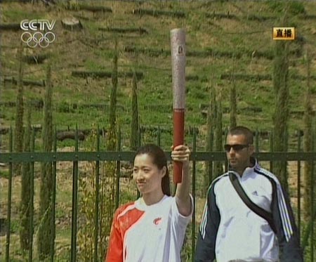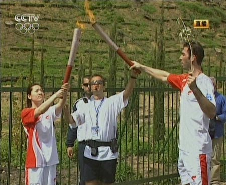 希臘境內(nèi)參與火炬?zhèn)鬟f的來自奧運東道國的羅雪娟從火炬手亞歷山大•尼克拉澤斯手中接過火炬。