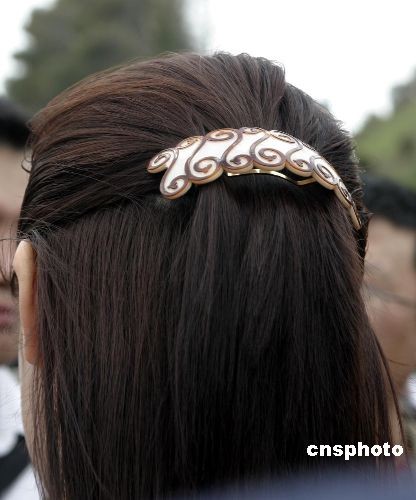 希臘當(dāng)?shù)貢r(shí)間3月24日,北京二00八年奧運(yùn)會(huì)圣火采集儀式在古奧林匹亞競(jìng)技場(chǎng)舉行,隨后火炬希臘傳遞開(kāi)始。第一位中國(guó)火炬手羅雪娟特意佩戴了一個(gè)與北京奧運(yùn)會(huì)火炬“祥云”圖案類似的發(fā)卡。中新社發(fā) 王歡 攝