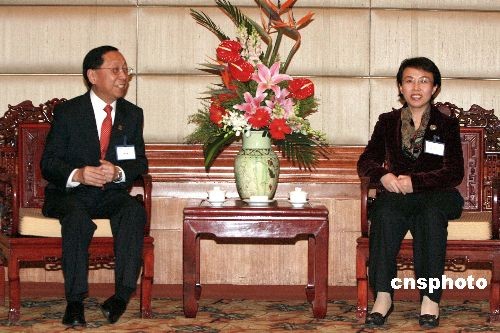 3月31日晚,北京市政府與中國(guó)香港商會(huì)座談會(huì)在北京舉行。北京市副市長(zhǎng)程紅(右)與中國(guó)香港商會(huì)會(huì)長(zhǎng)樊宇豪在會(huì)前交流。中新社發(fā) 廖文靜 攝
