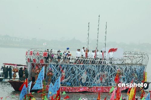 4月6日,第三屆中國(guó)濕地生態(tài)旅游節(jié)暨2008中國(guó)姜堰·溱潼會(huì)船節(jié)在江蘇省姜堰市溱湖風(fēng)景區(qū)開(kāi)幕。當(dāng)?shù)厝罕娤驍?shù)十萬(wàn)中外來(lái)賓再現(xiàn)了“天下第一會(huì)船”的盛況。會(huì)船節(jié)上展示的“鳥(niǎo)巢”貢船迎奧運(yùn)吸引了眾多觀眾的眼球。中新社發(fā) 楊素平 攝