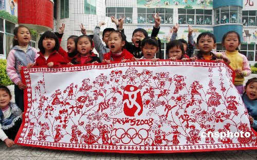 4月7日,幼兒園的小朋友在參觀《華夏兒女喜迎奧運(yùn)圣火》剪紙作品。近日,河南周口軍分區(qū)幼兒園老師陳雪英用兩周的時(shí)間加班制作出了一幅《華夏兒女喜迎奧運(yùn)圣火》的剪紙作品。據(jù)了解,該作品邊長(zhǎng)2.3米,寬0.75米,畫面上刻有福娃、五環(huán)、火炬、和平鴿和各民族娃娃,整幅作品用國(guó)花牡丹連接而成,四周是一百多個(gè)火炬,象征著奧運(yùn)圣火在全世界巡回傳遞,整幅作品表達(dá)了華夏各族兒女喜迎奧運(yùn)圣火的歡樂情景。中新社發(fā) 楊正華 攝
