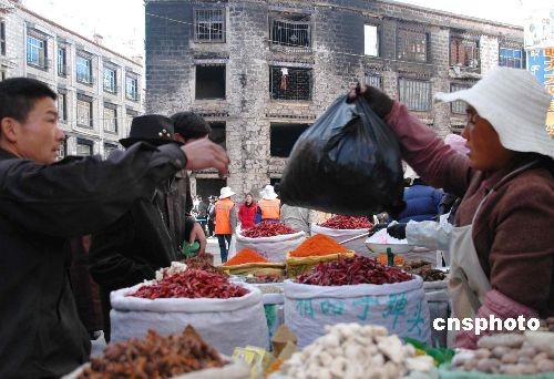 圖:暴力摧殘的拉薩沖賽康市場恢復(fù)營業(yè)
