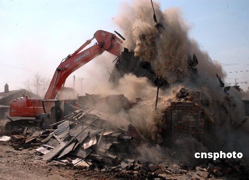 4月8日,黑龍江省黑河市城市管理行政執(zhí)法局及有關(guān)部門對(duì)東部棚戶區(qū)部分拒不履行搬遷義務(wù)的被拆遷戶依法定程序?qū)嵤⿵?qiáng)制拆遷。中新社發(fā) 邱齊龍 攝
