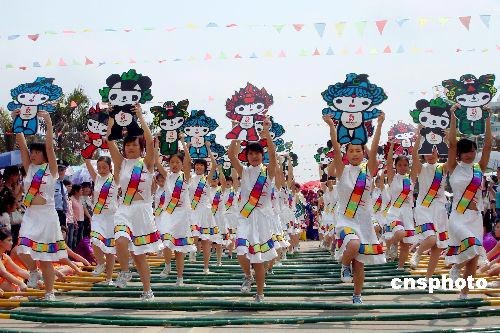 4月8日是中國最大的少數(shù)民族——壯族富有民族特色的傳統(tǒng)節(jié)日“三月三”歌圩!爸袊鴫燕l(xiāng)”廣西武鳴縣2008名壯族男女身著各色鮮艷的民族服裝,排著整齊的表演方陣,在近千米長的竹杠陣內(nèi),跳起民族傳統(tǒng)的竹杠舞歡慶節(jié)日,喜迎奧運(yùn)會。中新社發(fā) 黃艷梅 攝