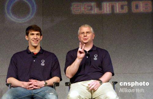4月14日,美國泳壇“神童”菲爾普斯(左)在芝加哥表示,他在北京奧運(yùn)會的目標(biāo)是贏得所有參賽項(xiàng)目的冠軍。他的教練鮑伯·褒曼透露,過去4年中菲爾普斯已經(jīng)在體能和蛙泳兩方面有很大進(jìn)步。作者: 李靜