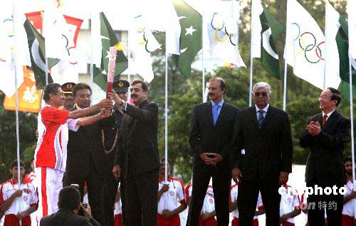 4月16日下午5時(shí),巴基斯坦曲棍球隊(duì)前隊(duì)長(zhǎng)義夫拉·汗從巴基斯坦總統(tǒng)穆沙拉夫和總理吉拉尼兩人手中接過(guò)第一棒“祥云”火炬,北京奧運(yùn)圣火開始在巴基斯坦首都伊斯蘭堡傳遞。圖為巴基斯坦總統(tǒng)穆沙拉夫(左三)、總理吉拉尼(左五)與義夫拉·(左一)三人共舉火炬。作者: 沈晨