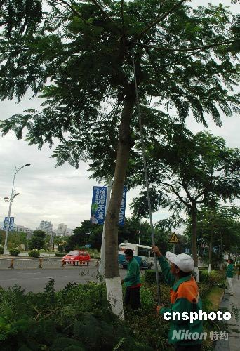 4月18日,海南三亞的園林工人在街道上修剪樹枝備戰(zhàn)臺風“浣熊”。中新社發(fā) 尹海明 攝