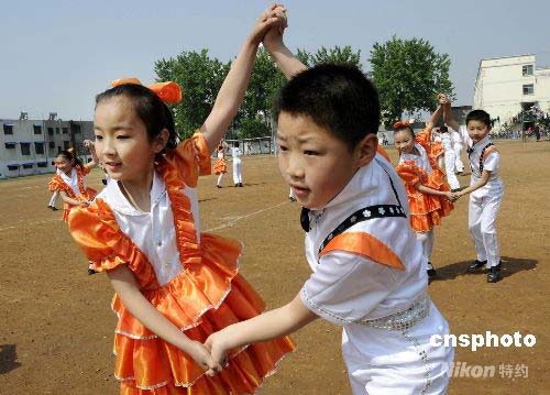 圖:山東棗莊中小學生跳起校園集體舞迎奧運