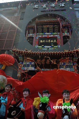 4月27日,為了迎接奧運賓朋重裝一新的北京老舍茶館重新開張。當日,老舍茶館舉辦第五屆茶文化節(jié)。據(jù)了解,近期北京眾多餐飲等第三產(chǎn)業(yè)商戶重裝改造迎接北京奧運所帶來的消費熱潮。 中新社發(fā) 廖攀 攝
