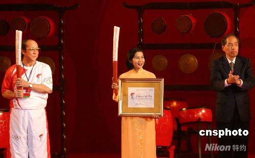 4月29日晚8時(shí)20分,在胡志明市第七軍區(qū)體育館內(nèi),越南奧委會(huì)主席阮明泰用手中的“祥云”火炬點(diǎn)燃圣火盆,北京奧運(yùn)圣火在胡志明市的傳遞就此順利結(jié)束。胡志明市歷時(shí)近兩個(gè)鐘頭的傳遞,為北京奧運(yùn)圣火“和諧之旅”國(guó)外19個(gè)城市的傳遞劃上圓滿句號(hào)。30日上午10時(shí),北京奧運(yùn)圣火將隨“奧運(yùn)圣火號(hào)”飛往“東方之珠”香港,并于下午2時(shí)左右進(jìn)入中國(guó)領(lǐng)土。圖為北京奧組委執(zhí)行副主席李炳華(右),向胡志明市副市長(zhǎng)阮氏秋霞(中)頒發(fā)證書。中新社發(fā) 沈晨 攝