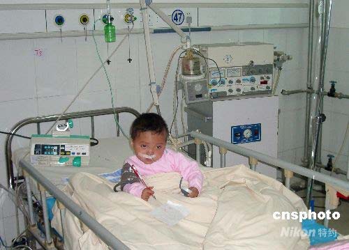 4月29日,阜陽市第二人民醫(yī)院,一4歲女患兒在重癥監(jiān)護病房接受恢復性治療。中新社發(fā) 張婭子 攝