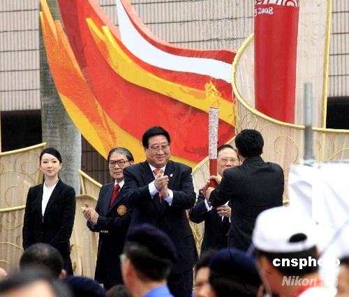 曾蔭權(quán)從北京奧組委執(zhí)行副主席楊樹安手中接過火炬。中新社發(fā) 王麗南 攝