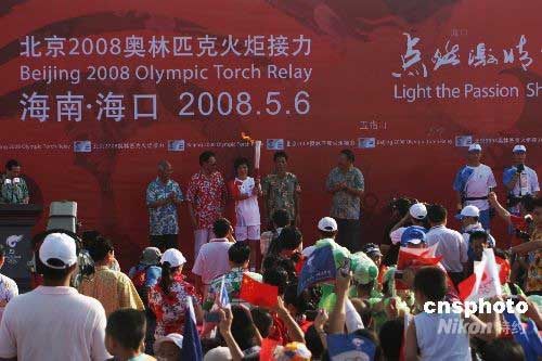 5月6日,北京奧運圣火在?谑袀鬟f。圖為第一棒火炬手王麗芳向觀眾展示奧運圣火。中新社發(fā) 尹海明 攝