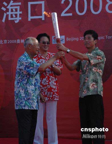 5月6日,北京奧運圣火開始在大陸境內第一個省會城市?趥鬟f。圖為北京奧組委執(zhí)委、國際奧委會委員、中國奧委會名譽主席何振梁(左)作為圣火使者將火炬交接給中共海南省委副書記于迅(右一)。中新社發(fā) 王辛莉 攝