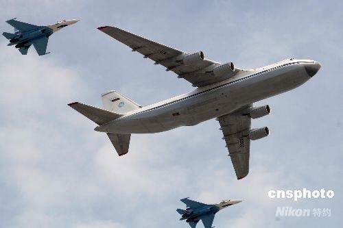 圖為飛機(jī)編隊(duì)飛臨紅場上空。當(dāng)天俄軍展示了30余種新式戰(zhàn)機(jī)。中新社發(fā) 田冰 攝