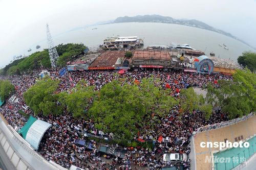 5月10日,圣火盆于16時(shí)18分在汕頭市人民廣場(chǎng)點(diǎn)燃,這標(biāo)志著北京奧運(yùn)圣火廣東省傳遞圓滿(mǎn)落幕。圖為當(dāng)圣火在中國(guó)跳水隊(duì)汕頭集訓(xùn)基地的露天跳水臺(tái)進(jìn)行傳遞的時(shí)候,毗鄰汕頭灣的街道上人潮洶涌護(hù)擁圣火。 中新社發(fā) 廖攀 攝