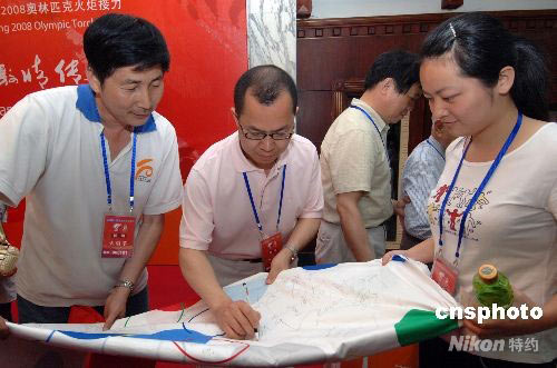 5月10日,在福州參加2008北京奧運(yùn)會(huì)火炬接力境內(nèi)傳遞福州站火炬手接待大會(huì)的部分火炬手,在一面奧運(yùn)五環(huán)旗上簽名。奧運(yùn)圣火11日將在福建省福州市進(jìn)行傳遞,路線全程為28.6公里,由208名火炬手完成。中新社發(fā) 劉可耕 攝