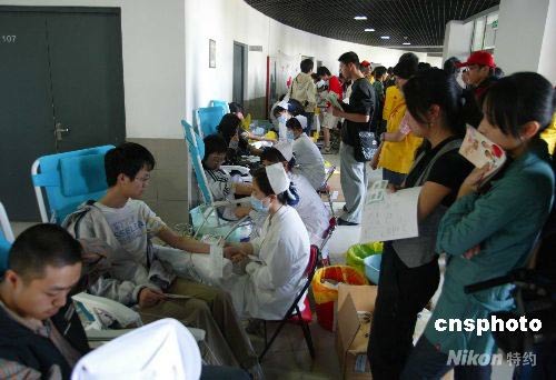 5月13日,清華大學(xué)紅十字會提出了“真情流淌 血脈相通”為汶川災(zāi)區(qū)緊急獻(xiàn)血的倡議,學(xué)子們踴躍參與。