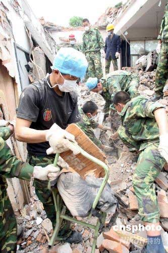 5月14日,成都軍區(qū)某特種大隊(duì)?wèi)?zhàn)士在清理地震廢墟現(xiàn)場。