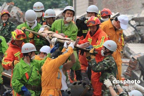 5月17日,上海公安消防救援隊(duì)在四川映秀鎮(zhèn)映秀灣發(fā)電廠的映電賓館廢墟里,發(fā)現(xiàn)有生命跡象。經(jīng)過10個(gè)多小時(shí)的緊張營(yíng)救,終于在18時(shí)15分將20歲的蔣雨航成功救出,他在廢墟里存活了124個(gè)小時(shí),其父母也在當(dāng)日下午從貴州趕到現(xiàn)場(chǎng)。中新社發(fā) 盛佳鵬 攝