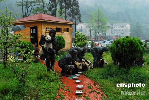 四川發(fā)生大地震后,臥龍保護(hù)區(qū)管理局的職工于第一時(shí)間將大熊貓轉(zhuǎn)移到安全地帶。在此次地震中,臥龍保護(hù)區(qū)管理局的房舍嚴(yán)重受損,其中32套大熊貓圈舍中有14套全部損毀,其余嚴(yán)重受損。據(jù)悉,工作人員目前正在尋找二到三只下落不明的大熊貓,其余所有熊貓被集中飼養(yǎng)在簡單修復(fù)的圈舍中,但圈舍比較擁擠。國家林業(yè)局和四川省林業(yè)廳已緊急調(diào)撥熊貓食品、藥品,以及保護(hù)區(qū)內(nèi)職工急需的帳篷等救援物資,現(xiàn)已繞道送至臥龍自然保護(hù)區(qū)。中新社發(fā) 臥龍 攝