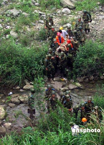 16日上午,師政治部主任高鵬帶領(lǐng)救援突擊隊(duì)和醫(yī)療小分隊(duì)172人,從綿竹市漢旺鎮(zhèn)出發(fā)向重災(zāi)區(qū)天池鄉(xiāng)幾個(gè)村里運(yùn)送救援物資,幫助群眾撤離震區(qū)。11時(shí)左右,當(dāng)部隊(duì)行至高橋以西500米處,突然發(fā)生余震,導(dǎo)致大量山石從山頂傾斜而下,直接威脅著正在這個(gè)路段通過的群眾。作訓(xùn)參謀祝紅杰突然發(fā)現(xiàn)一個(gè)孩子癱倒在石堆上,急忙上前搶抱他,孩子得救了,祝紅杰卻被亂石砸斷左腿,當(dāng)場倒地。作訓(xùn)參謀胡國才眼見一塊亂石砸向老人,極力將老人推到一邊,自己的頭部卻被亂石砸傷暈倒在地。同時(shí),該團(tuán)還有一名司務(wù)長和兩名戰(zhàn)士在救援中被泥石流砸傷…… 看到解放軍為救災(zāi)區(qū)群眾身負(fù)重傷,在現(xiàn)場的一些救災(zāi)志愿者迅即投入搶救部隊(duì)官兵的行動(dòng)中。運(yùn)送途中山路險(xiǎn)峻,他們拉一把、推一把,爭先恐后出把力氣。擔(dān)負(fù)救援撤離群眾任務(wù)的重慶市高新區(qū)人民醫(yī)院的醫(yī)護(hù)人員聞?dòng)嵑,一邊流著熱淚,一邊實(shí)施現(xiàn)場救護(hù),為他們贏得了寶貴的救治時(shí)機(jī)……