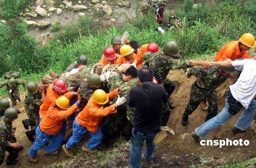 16日上午,師政治部主任高鵬帶領(lǐng)救援突擊隊(duì)和醫(yī)療小分隊(duì)172人,從綿竹市漢旺鎮(zhèn)出發(fā)向重災(zāi)區(qū)天池鄉(xiāng)幾個(gè)村里運(yùn)送救援物資,幫助群眾撤離震區(qū)。11時(shí)左右,當(dāng)部隊(duì)行至高橋以西500米處,突然發(fā)生余震,導(dǎo)致大量山石從山頂傾斜而下,直接威脅著正在這個(gè)路段通過(guò)的群眾。作訓(xùn)參謀祝紅杰突然發(fā)現(xiàn)一個(gè)孩子癱倒在石堆上,急忙上前搶抱他,孩子得救了,祝紅杰卻被亂石砸斷左腿,當(dāng)場(chǎng)倒地。作訓(xùn)參謀胡國(guó)才眼見一塊亂石砸向老人,極力將老人推到一邊,自己的頭部卻被亂石砸傷暈倒在地。同時(shí),該團(tuán)還有一名司務(wù)長(zhǎng)和兩名戰(zhàn)士在救援中被泥石流砸傷…… 看到解放軍為救災(zāi)區(qū)群眾身負(fù)重傷,在現(xiàn)場(chǎng)的一些救災(zāi)志愿者迅即投入搶救部隊(duì)官兵的行動(dòng)中。運(yùn)送途中山路險(xiǎn)峻,他們拉一把、推一把,爭(zhēng)先恐后出把力氣。擔(dān)負(fù)救援撤離群眾任務(wù)的重慶市高新區(qū)人民醫(yī)院的醫(yī)護(hù)人員聞?dòng)嵑,一邊流著熱淚,一邊實(shí)施現(xiàn)場(chǎng)救護(hù),為他們贏得了寶貴的救治時(shí)機(jī)……