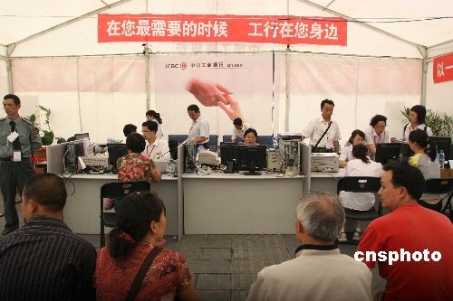 圖為工作人員為客戶(hù)提供服務(wù)。中國(guó)工商銀行都江堰支行是災(zāi)區(qū)災(zāi)后第一家全面開(kāi)展金融業(yè)務(wù)的銀行。