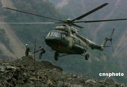 五月二十日上午十時,成都軍區(qū)陸航團姜廣偉王牌直升機組成功強降北川重災區(qū)“定時炸彈”--堰塞湖無名塌方小土堆上,水利地質(zhì)技術人員緊急跳下飛機,投入實地監(jiān)測水位。 中新社發(fā) 賈國榮 攝