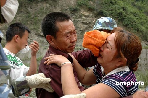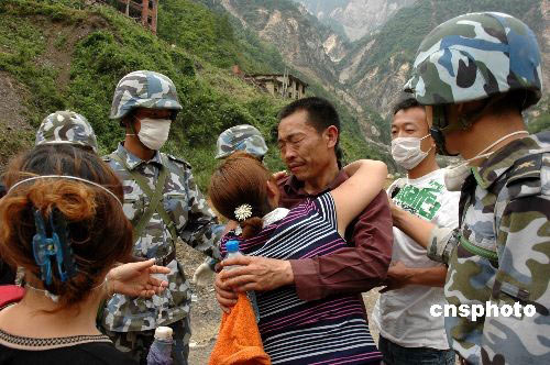 5月19日上午,100多名海軍陸戰(zhàn)隊員深入險境,克服重重險阻,將被困深山7天的礦工黃云躍解救出來,與妻子相見。夫妻重逢后相擁痛哭。李唐 攝