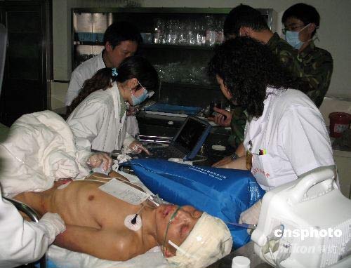 5月21日,四川省綿竹縣被埋8天8夜零4小時(196個小時)的天池煤礦礦工賴元平被救出,經解放軍255醫(yī)院醫(yī)療隊急救后由成都軍區(qū)直升飛機接至成都軍區(qū)總醫(yī)院救治。傷者在該院作CT檢查時被發(fā)現腦有內巨大血腫,時刻有生命危險,成都軍區(qū)總醫(yī)院顧建文副院長和解放軍301總醫(yī)院周定標教授研究后決定立即手術。手術由顧建文副院長主刀,1小時40分鐘后手術完成,術后傷員生命體癥平穩(wěn)。中新社發(fā) 朱琥姚遠 攝