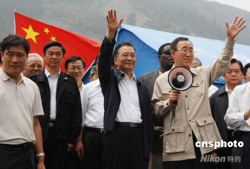 圖:溫家寶與聯(lián)合國秘書長潘基文在映秀會面
