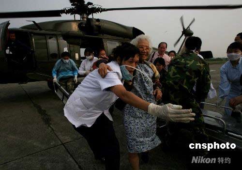 5月16日下午,二十六名境外游客游客從汶川大地震被稱為“孤島”的茂縣登上救援的中國(guó)空軍黑鷹直升機(jī),平安撤到四川省會(huì)成都。中新社發(fā) 賈國(guó)榮 攝