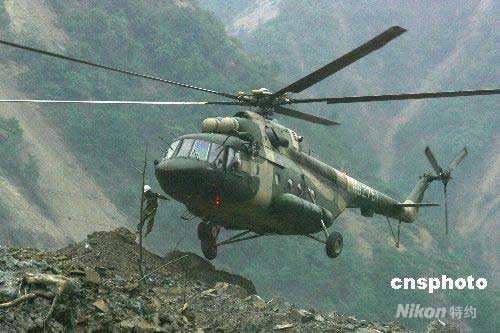 5月20日,成都軍區(qū)陸航團姜廣偉王牌直升機組上午十時成功以單輪強降北川重災區(qū)“定時炸彈”——堰塞湖無名塌方小土堆上,緊急運送水利地質技術隊實地監(jiān)測水位上漲危情。中新社發(fā) 賈國榮 攝