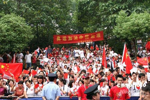 圖為在悶熱天氣中,熱情歡迎奧運(yùn)火炬?zhèn)鬟f的群眾。中新社發(fā) 崔佳明 攝