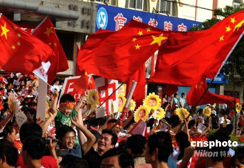 5月29日,奧運(yùn)圣火在安徽淮南傳遞,沿途民眾為北京奧運(yùn)加油喝彩。中新社發(fā) 廖攀 攝