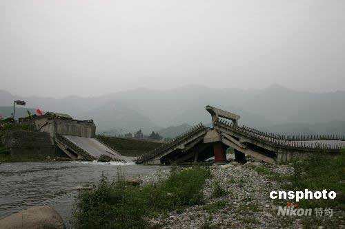 圖:四川彭州小魚洞大橋被震斷不能通行(2)