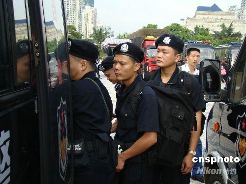 圖為海口特警隊員登車出發(fā)。中新社發(fā) 付美斌 攝