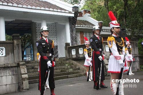 圖為陽明高中學(xué)生在慈湖陵寢前表演花式操槍。中新社發(fā) 耿軍 攝