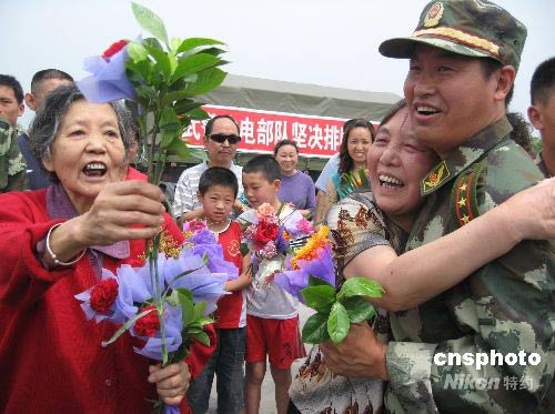 6月1日,許多綿陽市民自發(fā)前往南郊機(jī)場歡迎參加唐家山堰塞湖搶險(xiǎn)的武警官兵,并為他們獻(xiàn)花、送水。從5月31日起,參加唐家山堰塞湖搶險(xiǎn)的武警官兵陸續(xù)乘機(jī)返回綿陽市。中新社發(fā) 肖青 攝