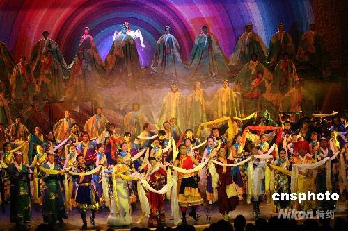 5月31日晚,西藏自治區(qū)文藝界舉行《幸福在路上》主題匯演,此系四川大地震后西藏首場(chǎng)大型演出,雪域兒女以吉祥哈達(dá)祝福祖國、祝福四川、祝福北京奧運(yùn)會(huì)。中新社發(fā) 賈長飛 攝